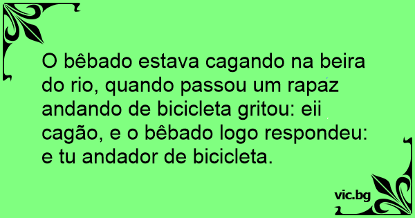 O bêbado estava cagando na beira do rio, quando passou um rapaz andando de bicicleta gritou: eii cagão, e o bêbado logo respondeu: e tu andador de bicicleta.