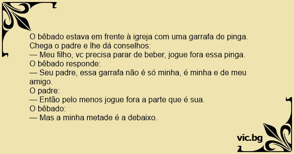 O bêbado estava em frente à igreja com uma garrafa de pinga. Chega o padre e lhe dá conselhos:
