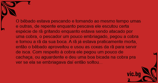 O bêbado estava pescando e tomando ao mesmo tempo umas e outras, de repente enquanto pescava ele escutou certa espécie de rã gritando enquanto estava sendo atacado por uma cobra, o pescador um pouco embriagado, pegou a cobra e tomou a rã da sua boca. A rã já estava praticamente morta, então o bêbado aproveitou e usou as coxas da rã para servir de isca. Com respeito à cobra ele pegou um pouco de cachaça, ou aguardente e deu uma boa bicada na cobra pra ver se ela se embriagava daí então soltou a cobra e voltou a pescar. Uma hоrа depois ele sentiu nas suas costas, toq,. Toq, toq, quando ele olhou era a cobra com mais duas rãs na boca para trocar por duas doze de aguardente.