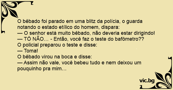 O bêbado foi parado em uma blitz da polícia, o guarda notando o estado etílico do homem, dispara: