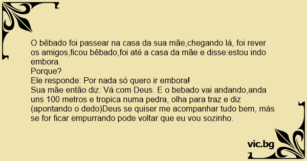 O bêbado foi passear na casa da sua mãe,chegando lá, foi rever os amigos,ficou bêbado,foi até a casa da mãe e disse:estou indo embora.