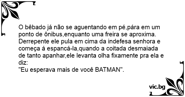 O bêbado já não se aguentando em pé,pára em um ponto de ônibus,enquanto uma freira se aproxima. Derrepente ele pula em cima da indefesa senhora e começa á espancá-la,quando a coitada desmaiada de tanto apanhar,ele levanta olha fixamente pra ela e diz: