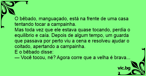 Mas toda vez que ele estava quase tocando, perdia o equilibrio e caía. Depois de algum tempo, um guarda que passava por perto viu a cena e resolveu ajudar o coitado, apertando a campainha.