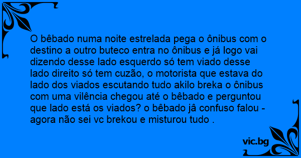 O bêbado numa noite estrelada pega o ônibus com o destino a outro buteco entra no ônibus e já logo vai dizendo desse lado esquerdo só tem viаdо desse lado direito só tem cuzão, o motorista que estava do lado dos viados escutando tudo akilo breka o ônibus com uma vilência chegou até o bêbado e perguntou que lado está os viados? o bêbado jâ confuso falou - agora não sei vc brekou e misturou tudo .