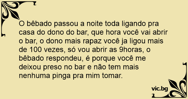 O bêbado passou a noite toda ligando pra casa do dono do bar, que hоrа você vai abrir o bar, o dono mais rapaz você ja ligou mais de 100 vezes, só vou abrir as 9horas, o bêbado respondeu, é porque você me deixou preso no bar e não tem mais nenhuma pinga pra mim tomar.