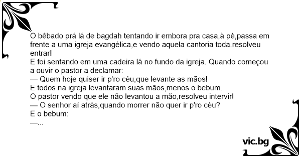 O bêbado prá lá de bagdah tentando ir embora pra casa,à pé,passa em frente a uma igreja evangélica,e vendo aquela cantoria toda,resolveu entrar!