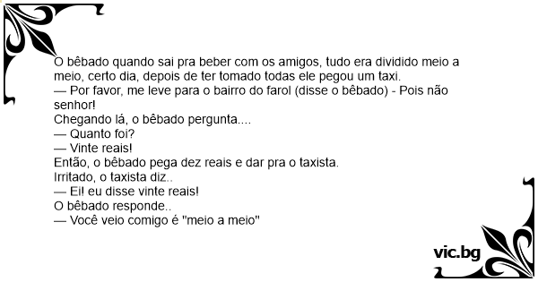 O bêbado quando sai pra beber com os amigos, tudo era dividido meio a meio, certo dia, depois de ter tomado todas ele pegou um taxi.