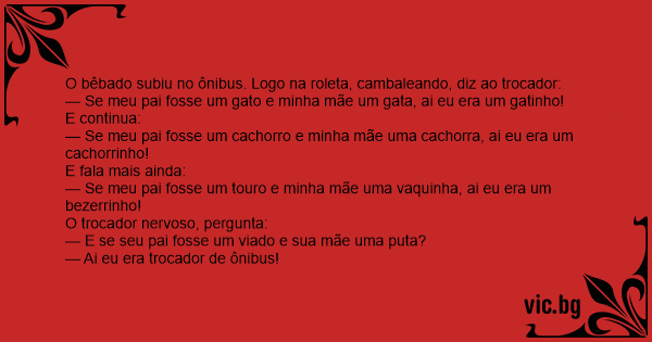 O bêbado subiu no ônibus. Logo na roleta, cambaleando, diz ao trocador:
