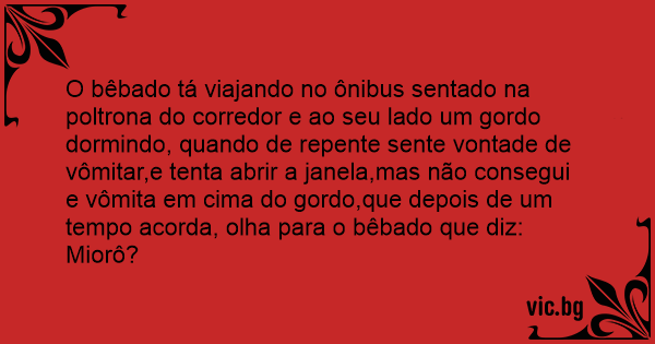 O bêbado tá viajando no ônibus sentado na poltrona do corredor e ao seu lado um gordo dormindo, quando de repente sente vontade de vômitar,e tenta abrir a janela,mas não consegui e vômita em cima do gordo,que depois de um tempo acorda, olha para o bêbado que diz: