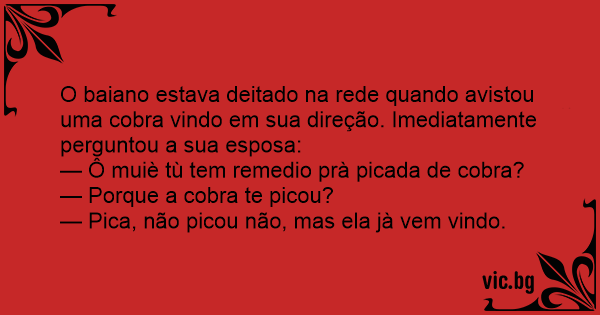 O baiano estava deitado na rede quando avistou uma cobra vindo em sua direção. Imediatamente perguntou a sua esposa: