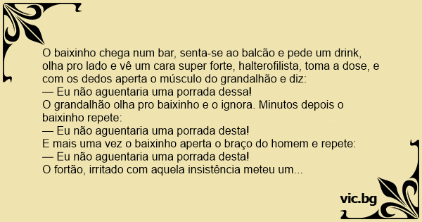 O baixinho chega num bar, senta-se ao balcão e pede um drink, olha pro lado e vê um cara super forte, halterofilista, toma a dose, e com os dedos aperta o músculo do grandalhão e diz: