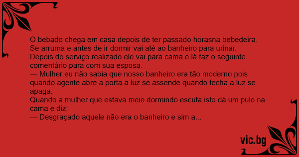 — Mulher eu não sabia que nosso banheiro era tão moderno pois quando agente abre a porta a luz se assende quando fecha a luz se apaga.
