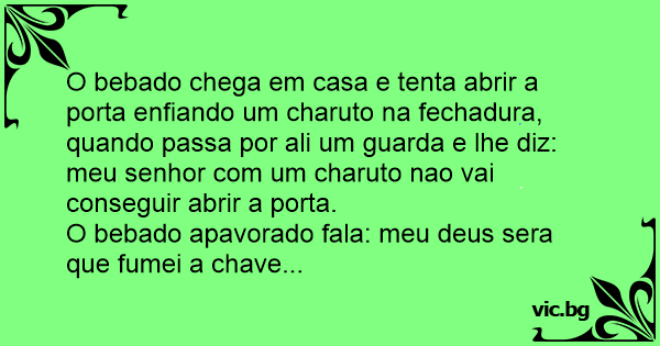 O bebado chega em casa e tenta abrir a porta enfiando um charuto na fechadura, quando passa por ali um guarda e lhe diz: meu senhor com um charuto nao vai conseguir abrir a porta.