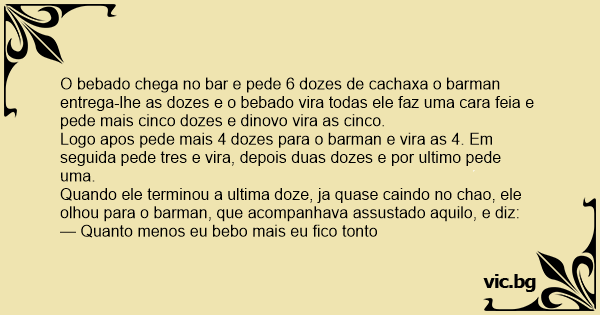 O bebado chega no bar e pede 6 dozes de cachaxa o barman entrega-lhe as dozes e o bebado vira todas ele faz uma cara feia e pede mais cinco dozes e dinovo vira as cinco.