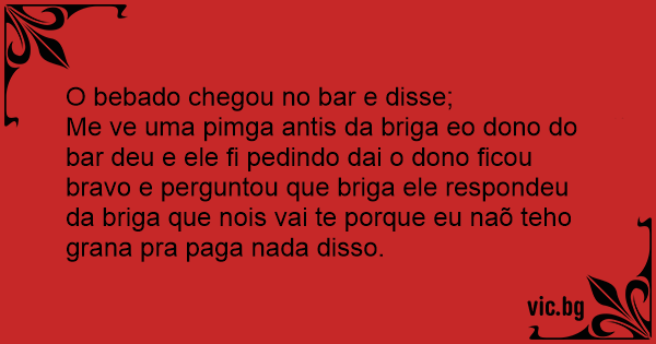Me ve uma pimga antis da briga eo dono do bar deu e ele fi pedindo dai o dono ficou bravo e perguntou que briga ele respondeu da briga que nois vai te porque eu naõ teho grana pra paga nada disso.