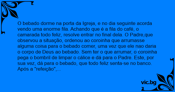O bebado dorme na porta da Igreja, e no dia seguinte acorda vendo uma enorme fila. Achando que é a fila do café, o camarada todo feliz, resolve entrar no final dela. O Padre,que observou a situação, ordenou ao coroinha que arrumasse alguma coisa para o bebado comer, uma vez que ele nao daria o corpo de Deus ao bebado. Sem ter o que arrumar, o coroinha pega o bombril de limpar o cálice e dá para o Padre. Este, por sua vez, dá para o bebado, que todo feliz senta-se no banco.