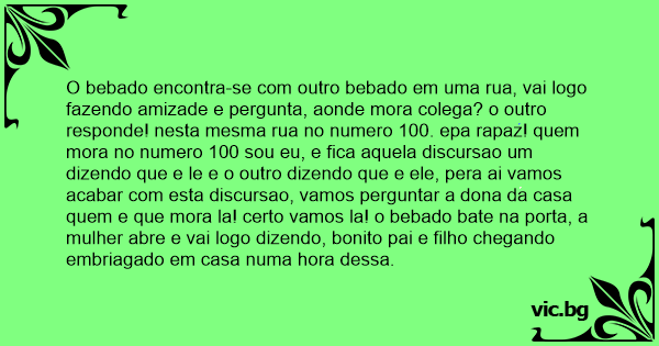 O bebado encontra-se com outro bebado em uma rua, vai logo fazendo amizade e pergunta, aonde mora colega? o outro responde! nesta mesma rua no numero 100. epa rapaz! quem mora no numero 100 sou eu, e fiса aquela discursao um dizendo que e le e o outro dizendo que e ele, pera ai vamos acabar com esta discursao, vamos perguntar a dona da casa quem e que mora la! certo vamos la! o bebado bate na porta, a mulher abre e vai logo dizendo, bonito pai e filho chegando embriagado em casa numa hоrа dessa.