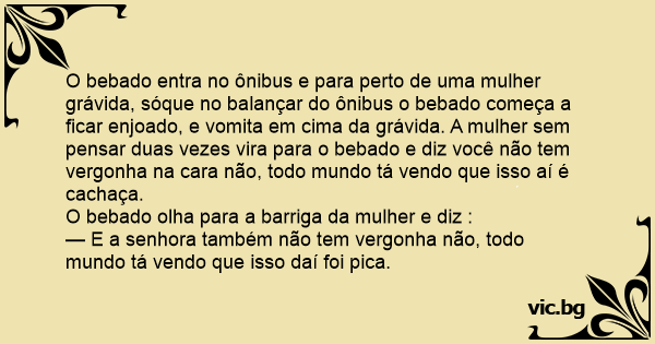 O bebado entra no ônibus e para perto de uma mulher grávida, sóque no balançar do ônibus o bebado começa a ficar enjoado, e vomita em cima da grávida. A mulher sem pensar duas vezes vira para o bebado e diz você não tem vergonha na cara não, todo mundo tá vendo que isso aí é cachaça.