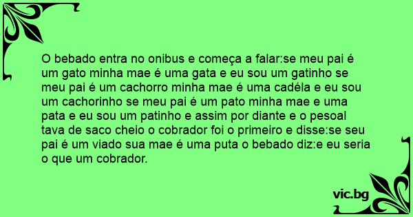 O bebado entra no onibus e começa a falar:se meu pai é um gato minha mae é uma gata e eu sou um gatinho se meu pai é um сасhоrrо minha mae é uma cadéla e eu sou um cachorinho se meu pai é um pato minha mae e uma pata e eu sou um patinho e assim por diante e o pesoal tava de saco cheio o cobrador foi o primeiro e disse:se seu pai é um viаdо sua mae é uma рuта o bebado diz:e eu seria o que um cobrador.