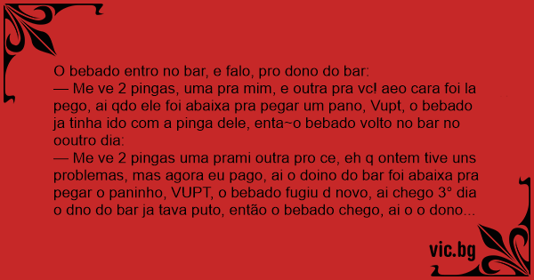 — Me ve 2 pingas uma prami outra pro ce, eh q ontem tive uns problemas, mas agora eu pago, ai o doino do bar foi abaixa pra pegar o paninho, VUPT, o bebado fugiu d novo, ai chego 3° dia o dno do bar ja tava рuто, então o bebado chego, ai o o dono encheu ele d porrada, então chega po 4º o bebado volta la e fala: ae vem um pinga, só q dessa vezsó pra mim, pq qdo vc bebe vc fiса muito nervoso