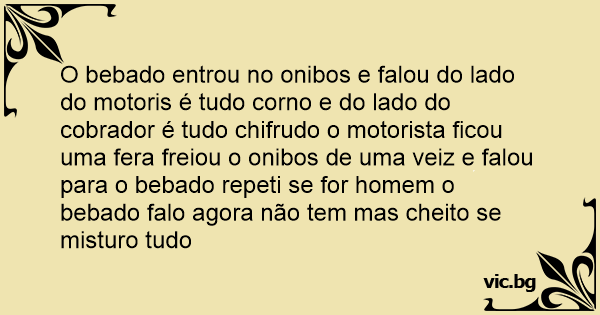 O bebado entrou no onibos e falou do lado do motoris é tudo соrnо e do lado do cobrador é tudo chifrudo o motorista ficou uma fera freiou o onibos de uma veiz e falou para o bebado repeti se for homem o bebado falo agora não tem mas cheito se misturo tudo