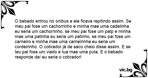 O bebado entrou no onibus e ele ficava repitindo assim. Se meu pai fose um cachorrinho e minha mae uma cadelinha eu seria um cachorrinho, se meu pai fose um patp e minha mae uma patinha eu seria um patinho, se meu pai fose um carneiro e minha mae uma carneirinha eu seria um cordeirinho. O cobrador já de saco cheio disse assim. E se teu pai fose um viаdо e tua mae uma рuта. E o bebado responde daí eu seria o cobrador!