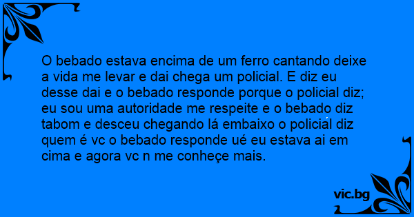 O bebado estava encima de um ferro cantando deixe a vida me levar e dai chega um policial. E diz eu desse dai e o bebado responde porque o policial diz; eu sou uma autoridade me respeite e o bebado diz tabom e desceu chegando lá embaixo o policial diz quem é vc o bebado responde ué eu estava ai em cima e agora vc n me conheçe mais.