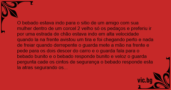 O bebado estava indo para o sitio de um amigo com sua mulher dentro de um corcel 2 velho só os pedaços e preferiu ir por uma estrada de chão estava indo em alta velocidade quando la na frente avistou um tira e foi chegando perto e nada de freiar quando derrepente o guarda mete a mão na frente e pede para os dois descer do carro e o guarda fala para o bebado bunito e o bebado responde bunito e veloz o guarda pergunta cade os cintos de segurança o bebado responde esta la atras segurando os bujoes o guarda pergunta para a mulher do bebado seu marido é sempre emgraçadim assim a mulher do bebado responde só quando ele bebe o guarda fala para o bebado vou teque tirar a sua carteira de abilitação o bebado responde vichi seu guarda pode tirar eu já tentei tirar mas não consegui