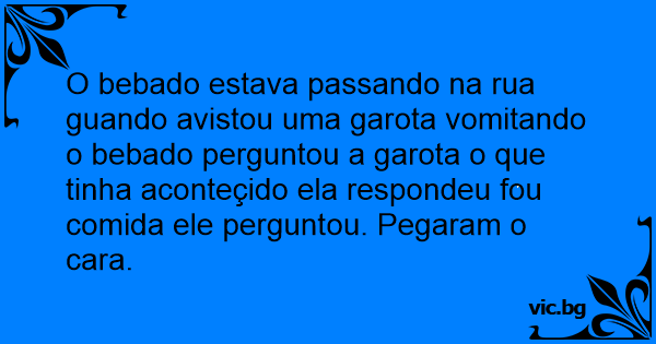 O bebado estava passando na rua guando avistou uma garota vomitando o bebado perguntou a garota o que tinha aconteçido ela respondeu fou comida ele perguntou. Pegaram o cara.