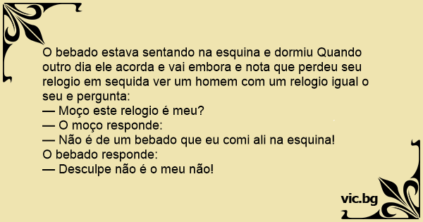 O bebado estava sentando na esquina e dormiu Quando outro dia ele acorda e vai embora e nota que perdeu seu relogio em sequida ver um homem com um relogio igual o seu e pergunta: