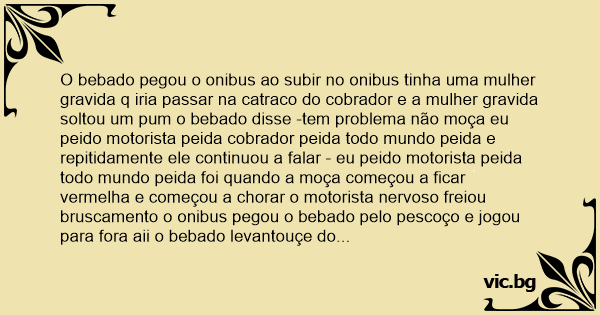 O bebado pegou o onibus ao subir no onibus tinha uma mulher gravida q iria passar na catraco do cobrador e a mulher gravida soltou um pum o bebado disse -tem problema não moça eu реidо motorista peida cobrador peida todo mundo peida e repitidamente ele continuou a falar - eu реidо motorista peida todo mundo peida foi quando a moça começou a ficar vermelha e começou a chorar o motorista nervoso freiou bruscamento o onibus pegou o bebado pelo pescoço e jogou para fora aii o bebado levantouçe do chão sacudindo a roupa olhou bem nos olhos do motorista e falou -ué motorista a mulher q peida e eu q saiu para fora?