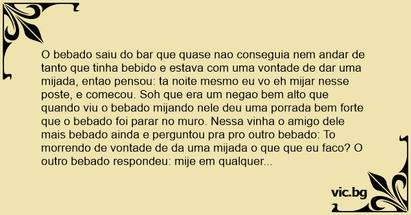 O bebado saiu do bar que quase nao conseguia nem andar de tanto que tinha bebido e estava com uma vontade de dar uma mijada, entao pensou: ta noite mesmo eu vo eh mijar nesse poste, e comecou. Soh que era um negao bem alto que quando viu o bebado mijando nele deu uma porrada bem forte que o bebado foi parar no muro. Nessa vinha o amigo dele mais bebado ainda e perguntou pra pro outro bebado: To morrendo de vontade de da uma mijada o que que eu faco? O outro bebado respondeu: mije em qualquer lugar mas nao mije naquele poste preto que ta dando choque.