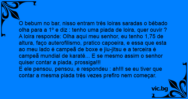 A loira responde: Olha aqui meu senhor, eu tenho 1,75 de altura, faço auterofilismo, pratico capoeira, e essa que esta ao meu lado é campeã de boxe e jiu-jitsu e a terceira é campeã mundial de karatê... E se mesmo assim o senhor quiser contar a piada, prossiga!!!
