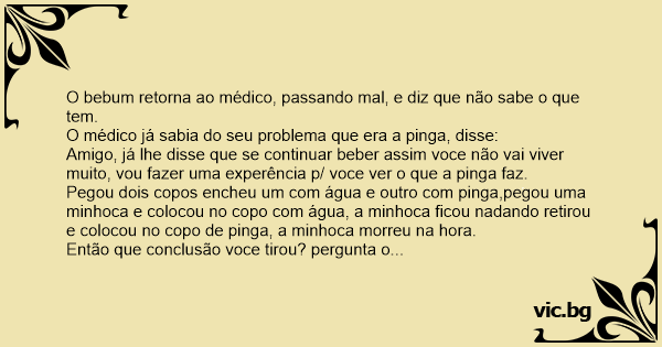 Pegou dois copos encheu um com água e outro com pinga,pegou uma minhoca e colocou no copo com água, a minhoca ficou nadando retirou e colocou no copo de pinga, a minhoca morreu na hоrа.
