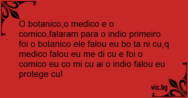 O botanico,o medico e o comico,falaram para o indio primeiro foi o botanico ele falou eu bo ta ni cu,q medico falou eu me di cu e foi o comico eu co mi cu ai o indio falou eu protege cu!