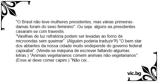 "Vasilhas de luz refratória podem ser levadas ao forno de microondas sem queimar". (Alguém poderia traduzir?!) "O bem star dos abtantes da nossa cidade muito endepende do governo federal capixaba". (Vende-se máquina de escrever faltando algumas letras.) "Animais vegetarianos comem animais não-vegetarianos". (Esse aí deve comer capim.) "Não cei se o presidente está melhorando as insdiferenças sociais ou promovendo o sarneamento dos pobres. Me pré-ocupa o avanço regresssivo da violência urbana".(“Sarneamento” deve ser o conjunto de medidas adotadas por Sarney no Maranhão. Quer dizer, eu “axo”, mas não me “pré-ocupo” muito.) "Fidel Castro liderou a revolução industrial de 1917, que criou o comunismo na Russia". (Não, besta, foi o avô dele.) "O Convento da Penha foi construído no céculo 16 mas só no céculo 17 foi levado definitivamente para o alto do morro".(Demorou o "céculo" inteiro pra fazer a mudança.) "A História se divide em 4: Antiga, Média, Momentânea e Futura, a mais estudada hoje".(Esqueceu a História em Quadrinhos.) "Os índios sacrificavam os filhos que nasciam mortos matando todos assim que nasciam".