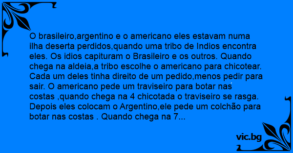 O brasileiro,argentino e o americano eles estavam numa ilha deserta perdidos,quando uma tribo de Indios encontra eles. Os idios capituram o Brasileiro e os outros. Quando chega na aldeia,a tribo escolhe o americano para chicotear. Cada um deles tinha direito de um pedido,menos pedir para sair. O americano pede um traviseiro para botar nas costas ,quando chega na 4 chicotada o traviseiro se rasga. Depois eles colocam o Argentino,ele pede um colchão para botar nas costas . Quando chega na 7 chicotada ele se rasga. E quando bota o Brasileiro,ele pede para botar o Argentino atrais deles.