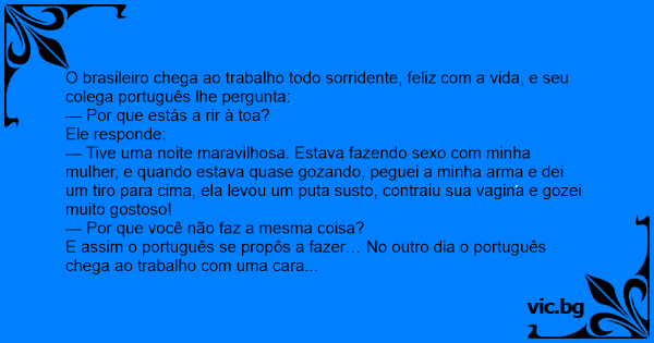 O brasileiro chega ao trabalho todo sorridente, feliz com a vida, e seu colega português lhe pergunta:
