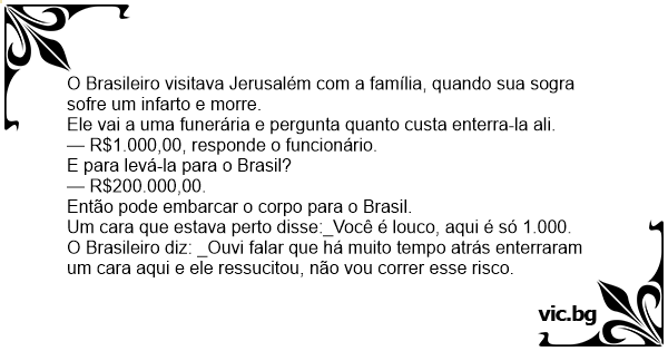 O Brasileiro diz: _Ouvi falar que há muito tempo atrás enterraram um cara aqui e ele ressucitou, não vou correr esse risco.