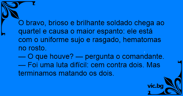 O bravo, brioso e brilhante soldado chega ao quartel e causa o maior espanto: ele está com o uniforme sujo e rasgado, hematomas no rosto.