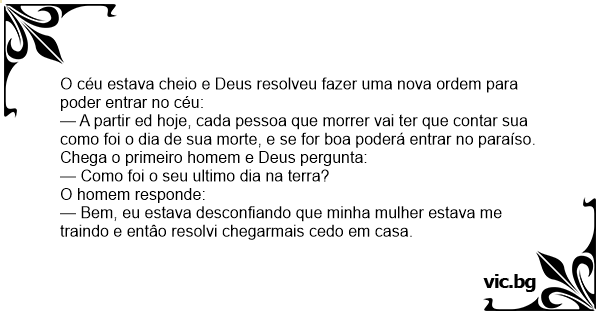 — A partir ed hoje, cada pessoa que morrer vai ter que contar sua como foi o dia de sua morte, e se for boa poderá entrar no paraíso.