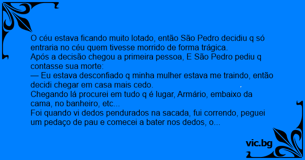 O céu estava ficando muito lotado, então São Pedro decidiu q só entraria no céu quem tivesse morrido de forma trágica.