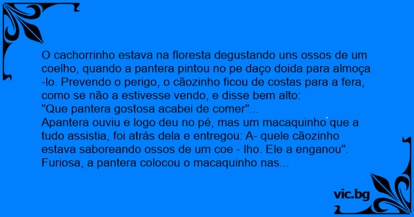 O cachorrinho estava na floresta degustando uns ossos de um coelho, quando a pantera pintou no pe daço doida para almoça-lo. Prevendo o perigo, o cãozinho ficou de costas para a fera, como se não a estivesse vendo, e disse bem alto: