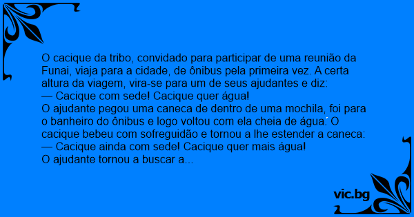 O cacique da tribo, convidado para participar de uma reunião da Funai, viaja para a cidade, de ônibus pela primeira vez. A certa altura da viagem, vira-se para um de seus ajudantes e diz: