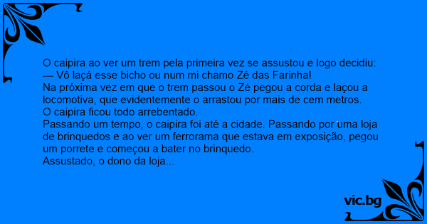 Passando um tempo, o caipira foi até a cidade. Passando por uma loja de brinquedos e ao ver um ferrorama que estava em exposição, pegou um porrete e começou a bater no brinquedo.