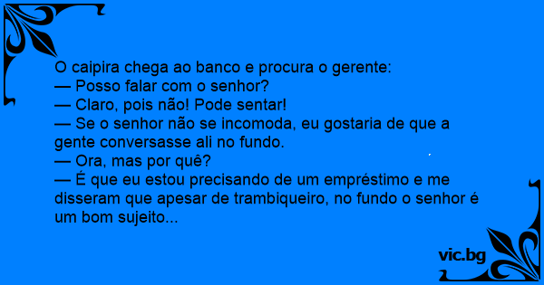— É que eu estou precisando de um empréstimo e me disseram que apesar de trambiqueiro, no fundo o senhor é um bom sujeito...