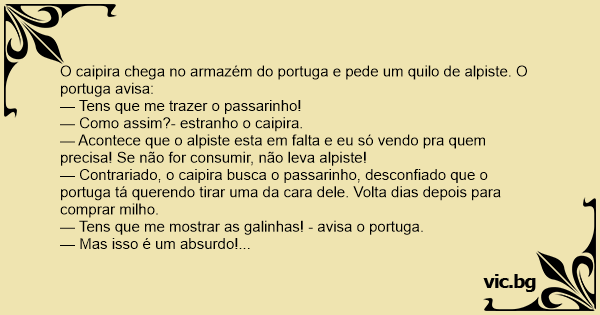 O caipira chega no armazém do portuga e pede um quilo de alpiste. O portuga avisa: