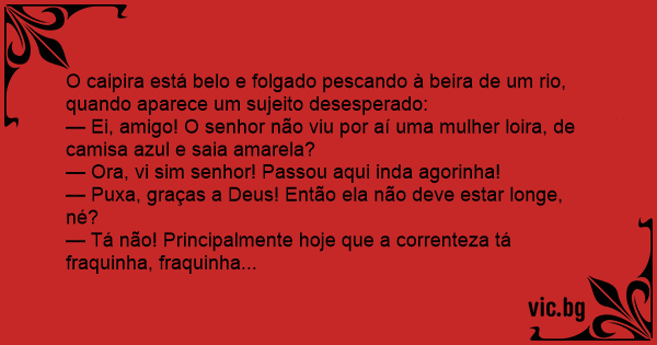 O caipira está belo e folgado pescando à beira de um rio, quando aparece um sujeito desesperado: