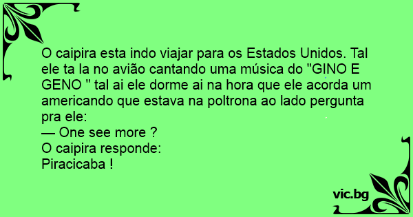 O caipira esta indo viajar para os Estados Unidos. Tal ele ta la no avião cantando uma música do "GINO E GENO " tal ai ele dorme ai na hоrа que ele acorda um americando que estava na poltrona ao lado pergunta pra ele:
