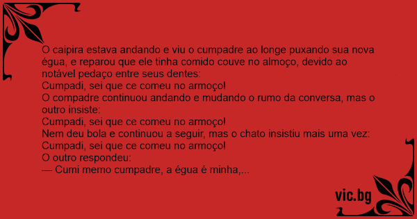 O caipira estava andando e viu o cumpadre ao longe puxando sua nova égua, e reparou que ele tinha comido couve no almoço, devido ao notável pedaço entre seus dentes: